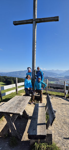 Pünktlich um 8.30 Uhr trafen wir in Betzigau und fuhren zum Parkplatz Schlettermoos. Frisch war es, jedoch nach wenigen Schritten kitzelte uns schon die Sonne an der Nase und war fortan unser ständiger Begleiter. Bereits nach 25 min waren wir auf der Höhe der Siedelalpe, die wir links liegen ließen, um Richtung Pfarralp weiterzuwandern, kurz vorher bogen wir zum herrlichen Aussichtspunkt mit Kreuz und Liegebank ab. Die Ausblicke zu den Allgäuer Hochalpen, dem großen Alpsee und auf das Alpenvorland sind immer wieder eine Augenweide. Gemütlich ging es weiter zur Thaler Höhe(1167m), leider wehte hier ein etwas kalter Wind und wir machten nur eine kurze Brotzeit. Der Rückweg führte uns durch den Reichlinger Wald über den Stixner Bach zur Jugetalpe. Dort gab es leckere Brotzeit oder Kuchen. Über das Köpfle ging es dann über die Fahrstraße zurück zum Parkplatz. Diesen herrlichen Herbsttag konnten wir in vollen Zügen genießen.