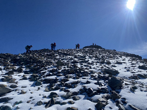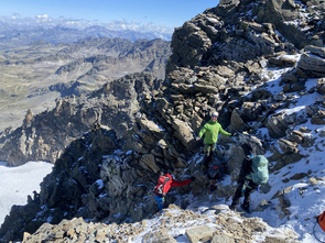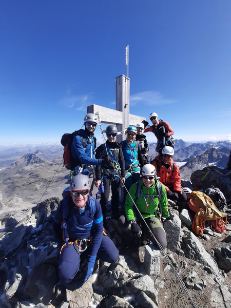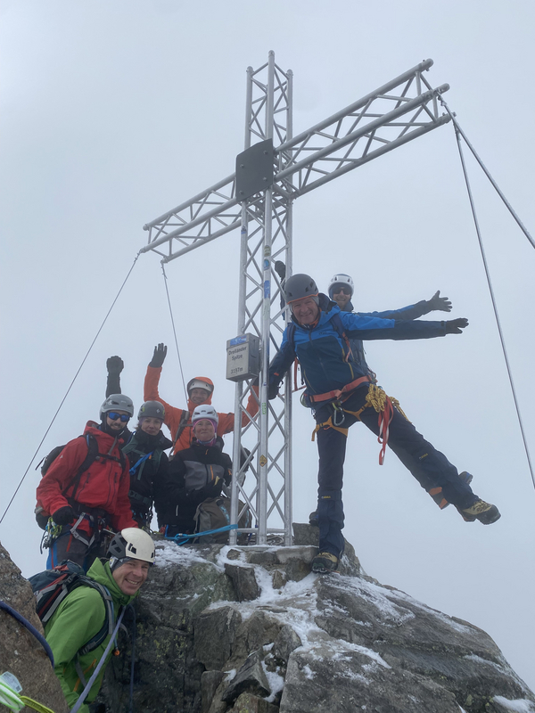 Die Dreitausendmetermarke erreicht und im Schatten unseres Tagesziels angekommen, zeigte sich der hier oben vorhandene Schneefall der letzten Tage – ausreichend, um zu verdecken, aber bei Weitem nicht tragfähig. Die meisten und großen Spalten waren hier zwar gut sichtbar, dennoch wurden die Seile ausgepackt und zwei Seilschaften aufgebaut. In diesen sind wir zügig durch die Buin-Lücke und die nur mehr aus Schutt und Blockwerk gebildete Flanke des Großen Piz Buin emporgestiegen, ehe wir uns ausbanden und das Material deponierten. Die weiteren 250 Höhenmeter waren für uns allesamt keine große Herausforderung, und nach dem zu durchsteigenden Kamin ging es recht entspannt zum Gipfelkreuz empor – der Sonne entgegen. Gegen 10:30 Uhr waren wir dann auf dem mit 3.312 m ü. A. höchsten Punkt Vorarlbergs angekommen und durften uns zu diesem tollen Gipfel beglückwünschen.