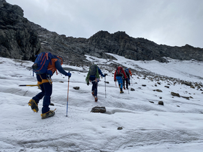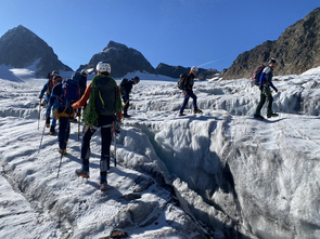 Eineinhalb Stunden später war es dann so weit – die Steigeisen kamen endlich zum Einsatz und der Pickel war fortan griffbereit! Wir betraten ohne Seilverbund den blanken und spaltenarmen Gletscher, auf die ausgeaperte Nordwestflanke zu, und erklommen auch rasch den Grat. Ab 9:15 Uhr hieß es dann aber erst einmal: Warten und Warmhalten. Am ausgesetzten und wenig Platz bietenden Gipfel war noch eine Seilschaft, die auch erst einmal wieder herunter musste, ehe wir den Gipfelgrat mit seiner Schlüsselstelle sicher begehen konnten.