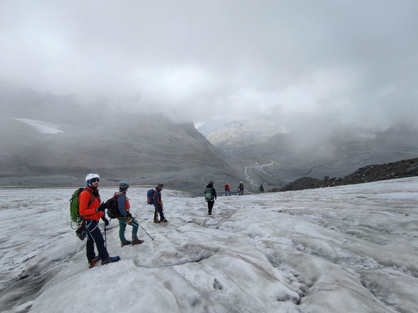 Nach dem Frühstück brachen wir frohen Mutes gegen 7:00 Uhr an der Hütte auf – wenngleich sich wider Erwarten, das Wetter nicht an die Prognose hielt. Der Weg führte uns recht gemütlich an Höhe gewinnend Richtung Südosten zum Vermuntgletscher, wo sich nach und nach auch unser Tagesziel aus dem Nebel heraus erkennen ließ.