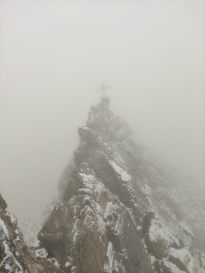 Um 10:00 Uhr erreichten wir das metallene Gipfelkreuz der Dreiländerspitze auf 3.197 m. Die Fernsicht war auch von diesem Gipfel eher glanzlos, und eine Gipfelbrotzeit verschoben wir auf ein windstilleres „Später“. Wir machten uns sodann an den Abstieg vom Gipfel und den Grat hinunter. Vorsorglich beide Seile im Gepäck führend, war auch der Rückweg trotz Nässe und Schnee gut und sicher machbar.