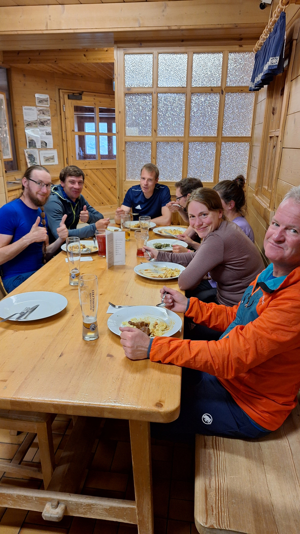 Zurück zur Hütte ging es ohne Umschweife, wo wir um Viertel nach fünf ankamen und mustergültig um zehn vor sechs am Tisch saßen. Gut gelaunt schmiedeten wir nach einem leckeren Abendessen die Pläne für den zweiten Tag: die Dreiländerspitze und vielleicht als Dreingabe die Hintere Jamspitze. Dass es draußen mittlerweile regnete, störte uns an diesem Abend nicht weiter.