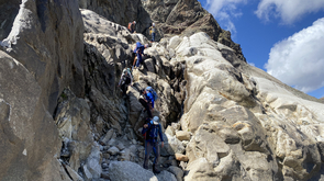 Gegen 12:15 Uhr machten wir uns wieder bereit und bauten unsere zwei Seilschaften erneut auf. Die Schneeauflage war inzwischen auch tageszeitentsprechend sulzig geworden. Wir wählten diesmal den Weg über die gut sichtbare Hauptspur vom Gletscher hinab, zogen an dessen Ende die Eisen wieder aus und stiegen weiter abwärts – diesmal auch mit geschickterer Route über die glattgeschliffene Stufe.