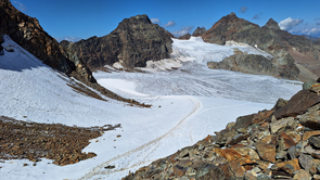 Der Weg zum vermeintlich zweiten Tagesziel wurde aber mangels des vermuteten Durchschlupfs eher länger denn kürzer, und auch vom Wetter waren wir nicht mehr ganz überzeugt. Einfach den gleichen Weg zurück, das wollten wir aber nicht. So schlugen wir den Weg zur Tiroler Scharte ein und arbeiteten uns weglos durch Blockwerk, Schutt und Gletscherreste hinauf, um dann über den Weg vom Vortag wieder zur Hütte zu gelangen.