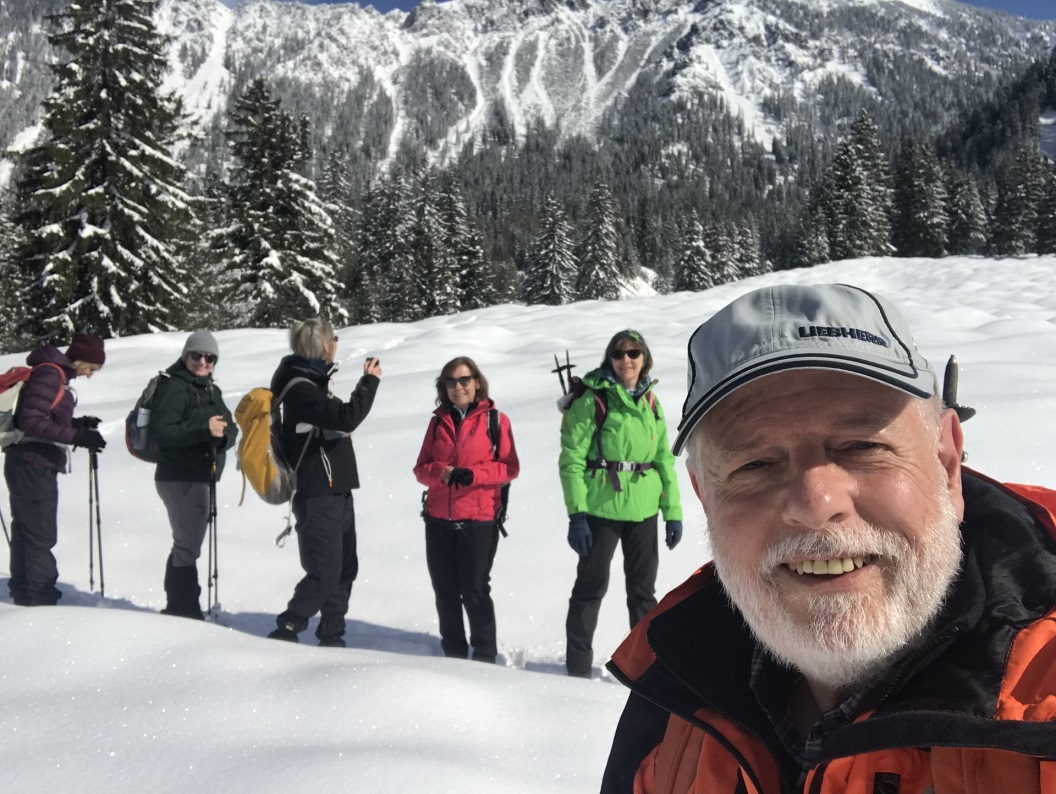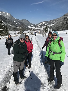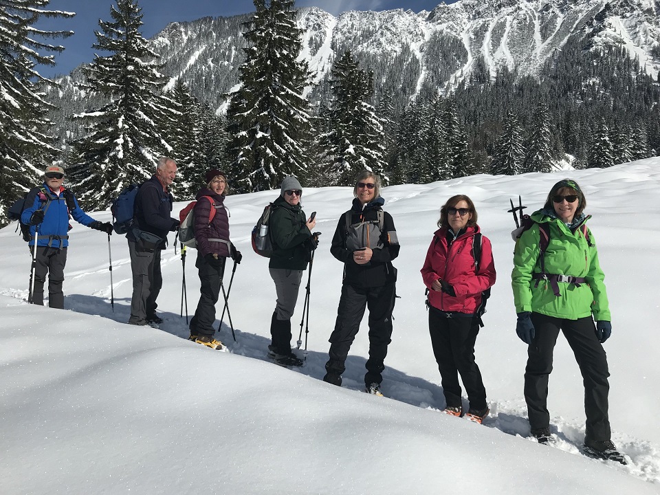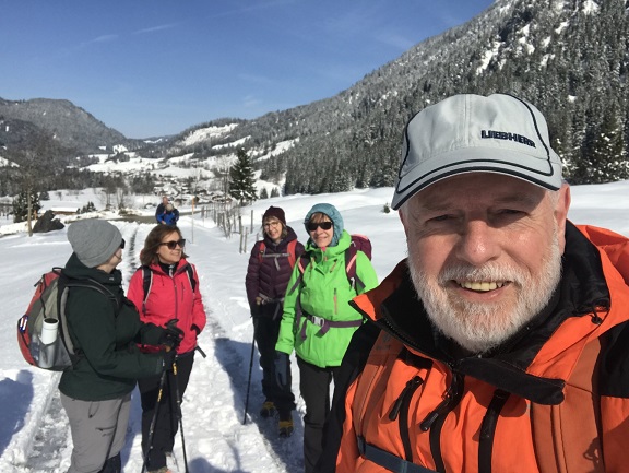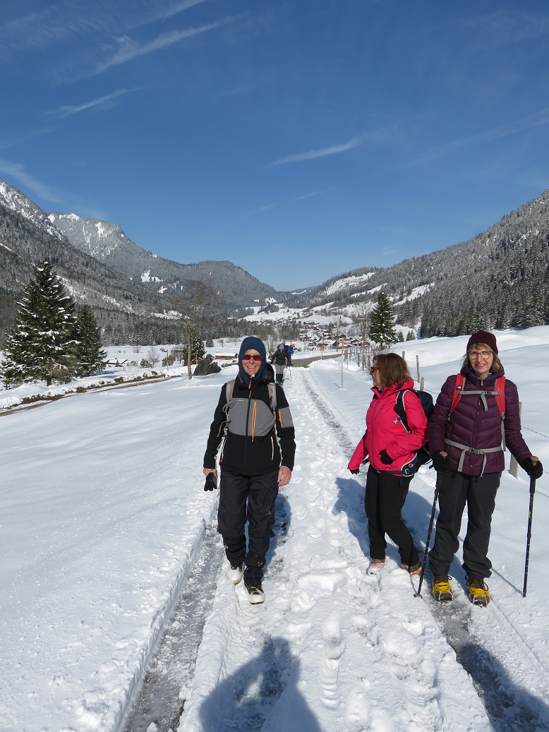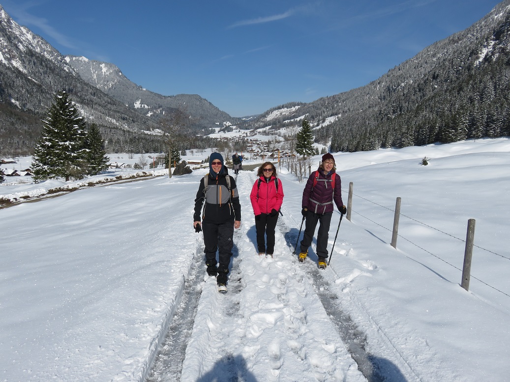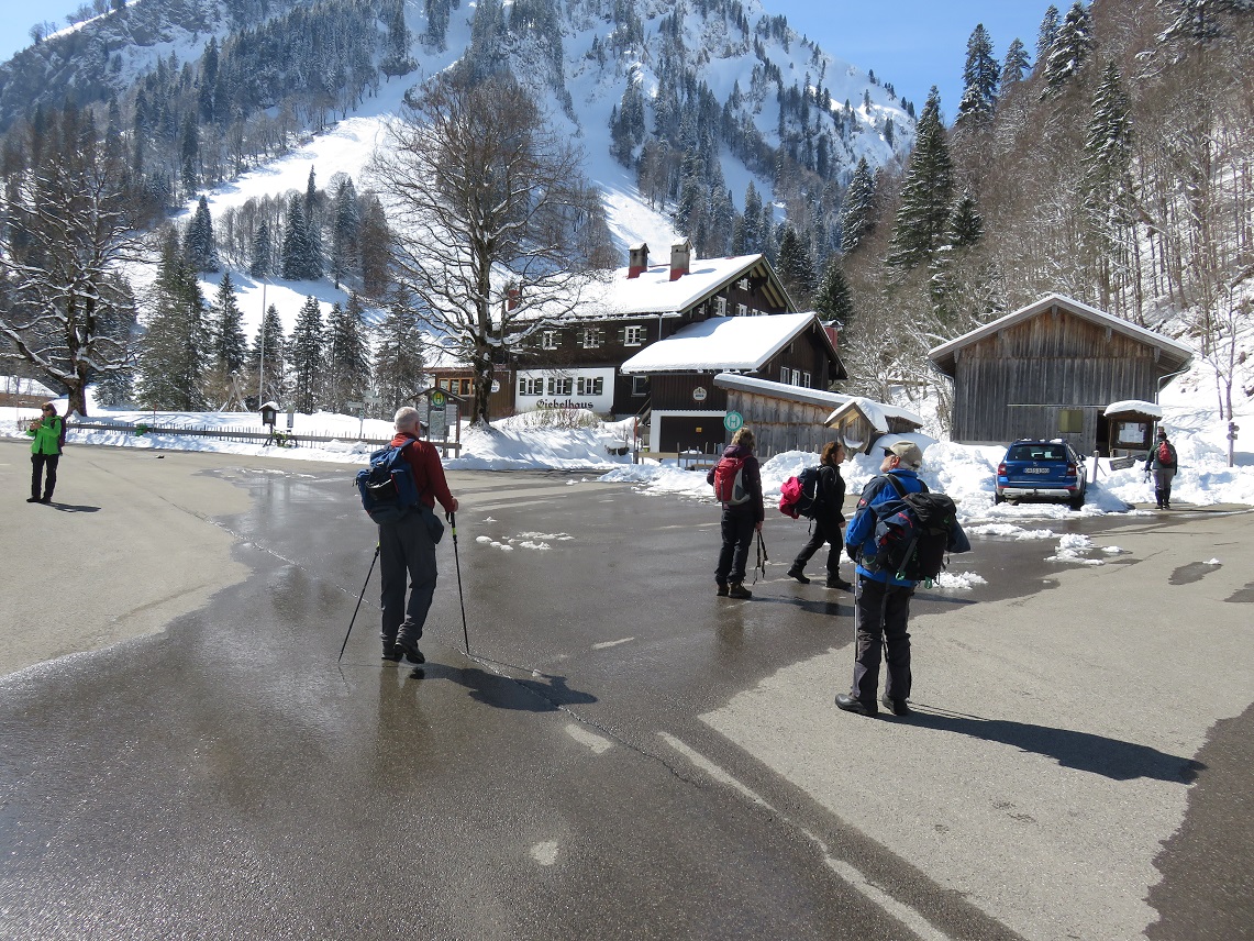 Schon im Raum Kempten war die Landschaft mit frischem Schnee überzogen, und alle freuten sich auf winterliche Verhältnisse, zumal die „Wetterfrösche“ für den Tag viel Sonnenschein angekündigt hatten. In Hinterstein, am Parkplatz Rauhornweg angekommen, war zwar wenig Publikum, aber ordentlich Neuschnee. Da der Weg, so weit wir ihn einsehen konnten, schneefrei erschien, blieben die Grödel erst einmal im Rucksack. Aber bereits nach 15 Minuten war es mit dem geräumten Weg vorbei. Nun mussten wir alle die Grödel aufziehen.