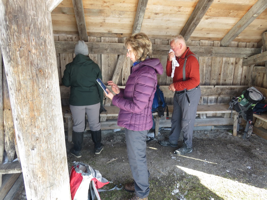 Am Giebelhaus angekommen, stellten wir dann fest, dass der Weg zur Schwarzenberghütte wegen Lawinengefahr gesperrt war. Wir planten um und ließen die Schwarzenberghütte aus. Einkehr ins Giebelhaus war nun angesagt. Außer uns waren kaum andere Gäste anwesend. Wir hatten einen großen Tisch, ausreichend für uns acht Wanderer, direkt am knisternden Holzfeuer. Nach einer ausgiebigen Rast mit gutem Essen und einem Kaffee zum Abschluss machten wir uns auf den „Rückweg“.