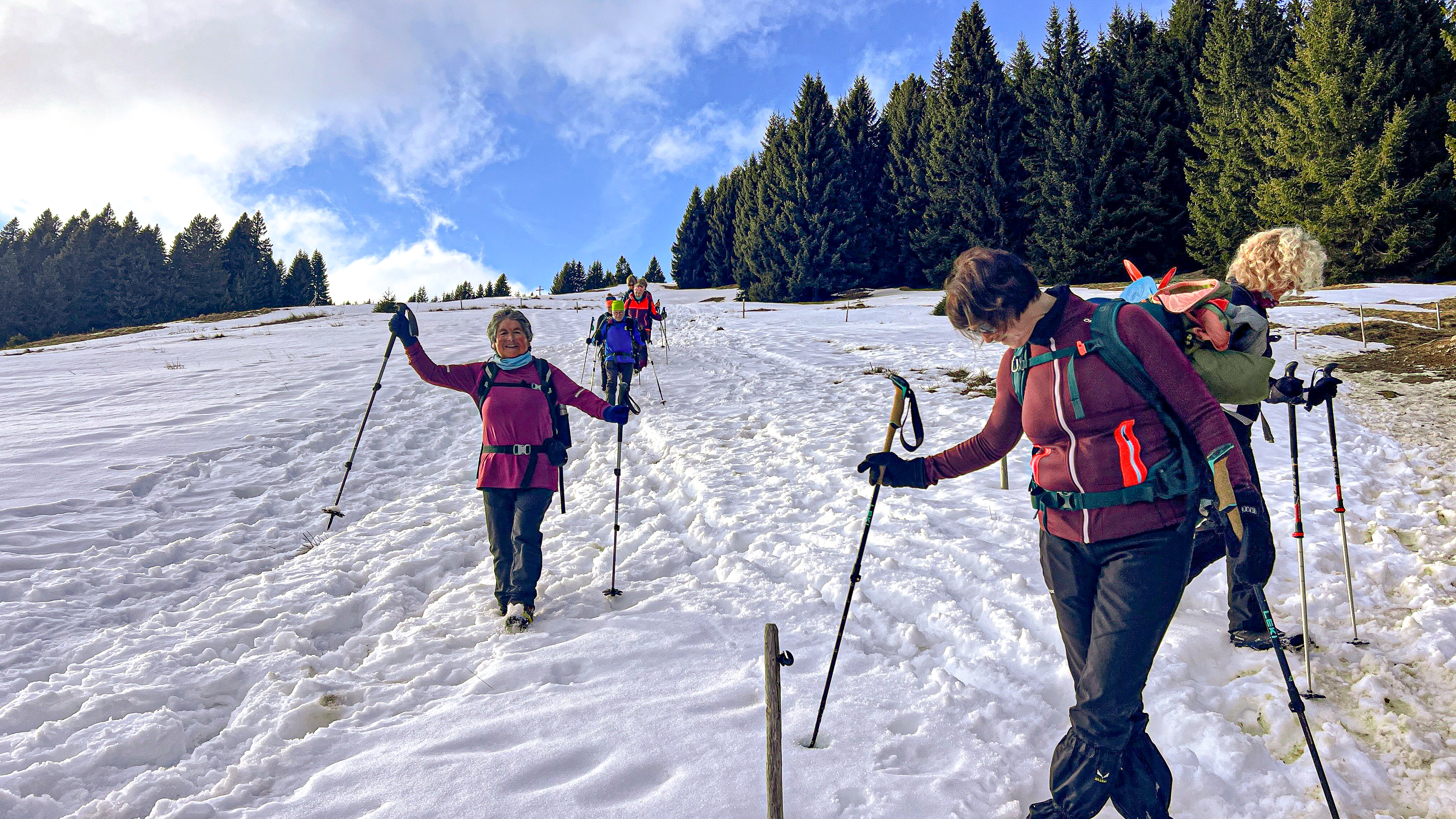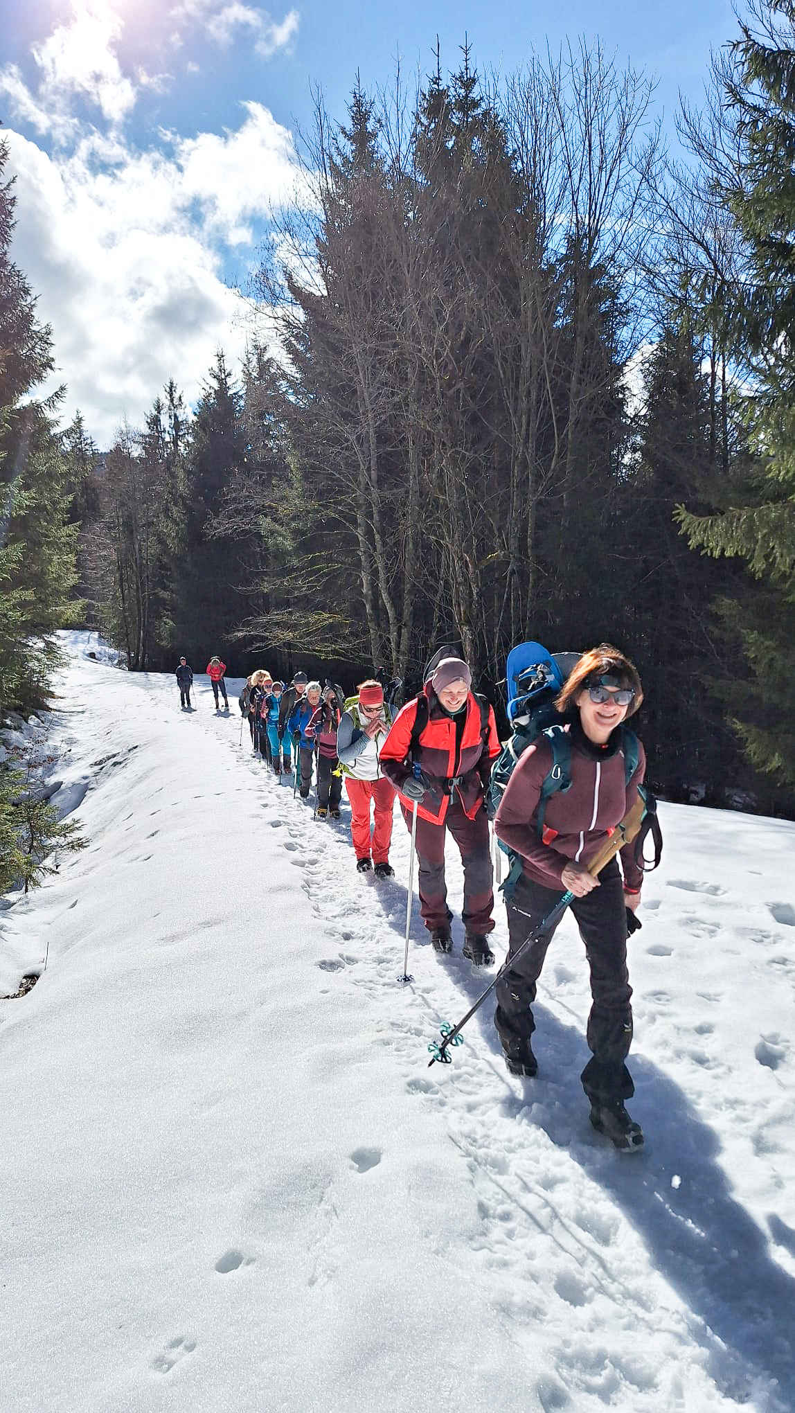 Unsere Schneeschuhwanderung, die bei den Schneebedingungen zur Winterwanderung wurde, führte uns zunächst ein Stück über den Höhenweg. Dieser war zwar teilweise etwas vereist, aber insgesamt gut mit Wanderschuhen machbar. Bei strahlender Sonne entschieden wir uns, die Grödel anzuziehen, bevor es in den Wald hineinging.