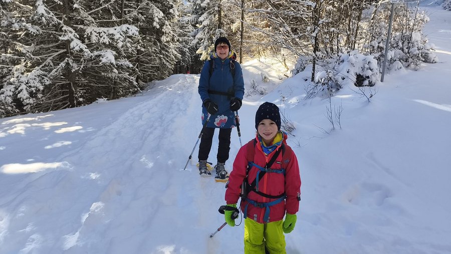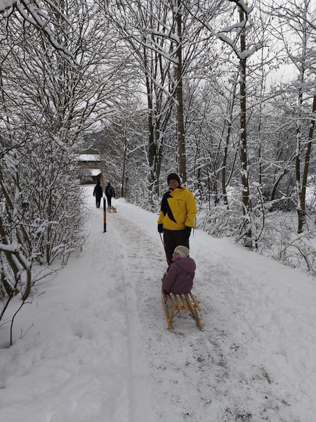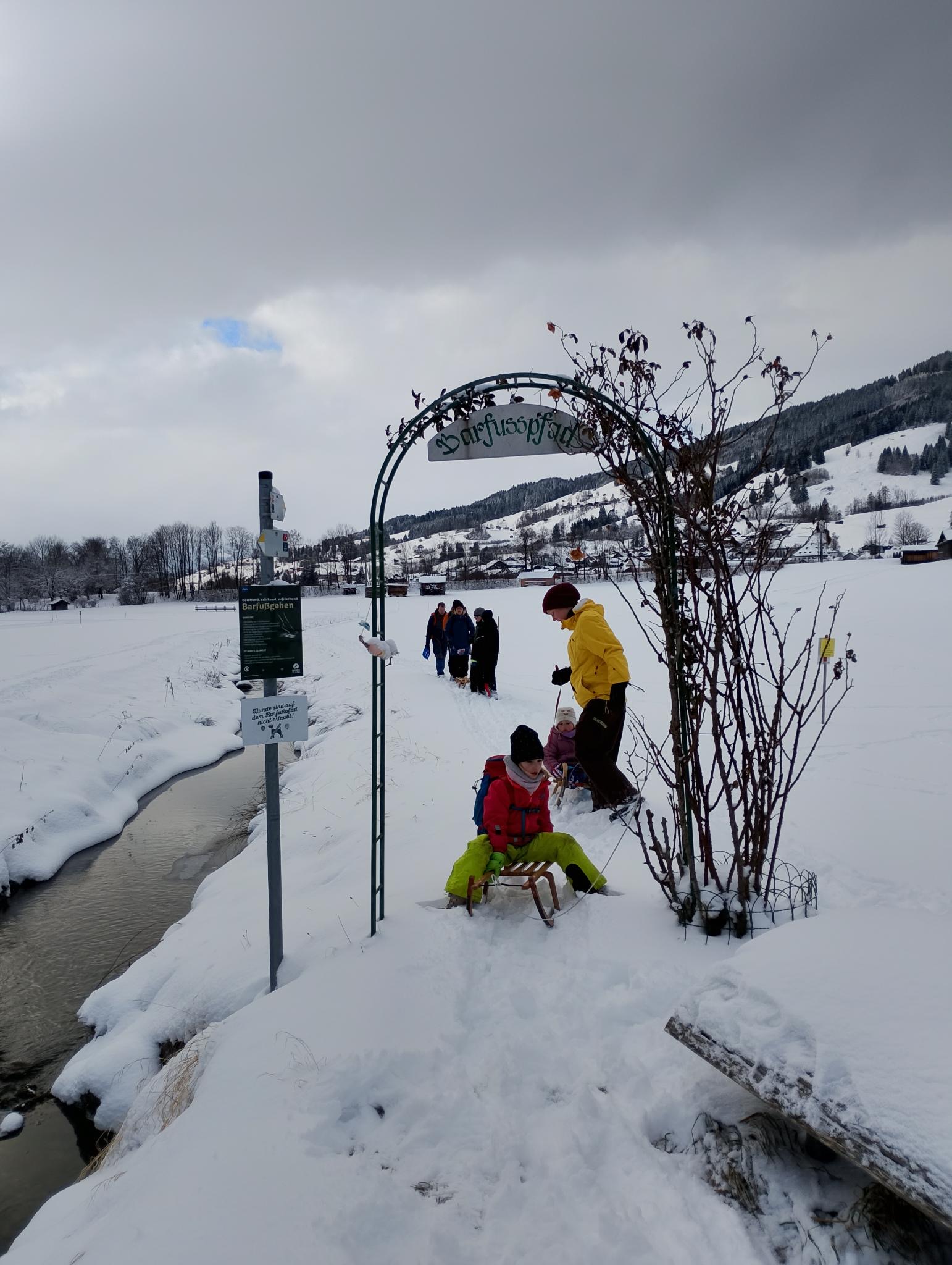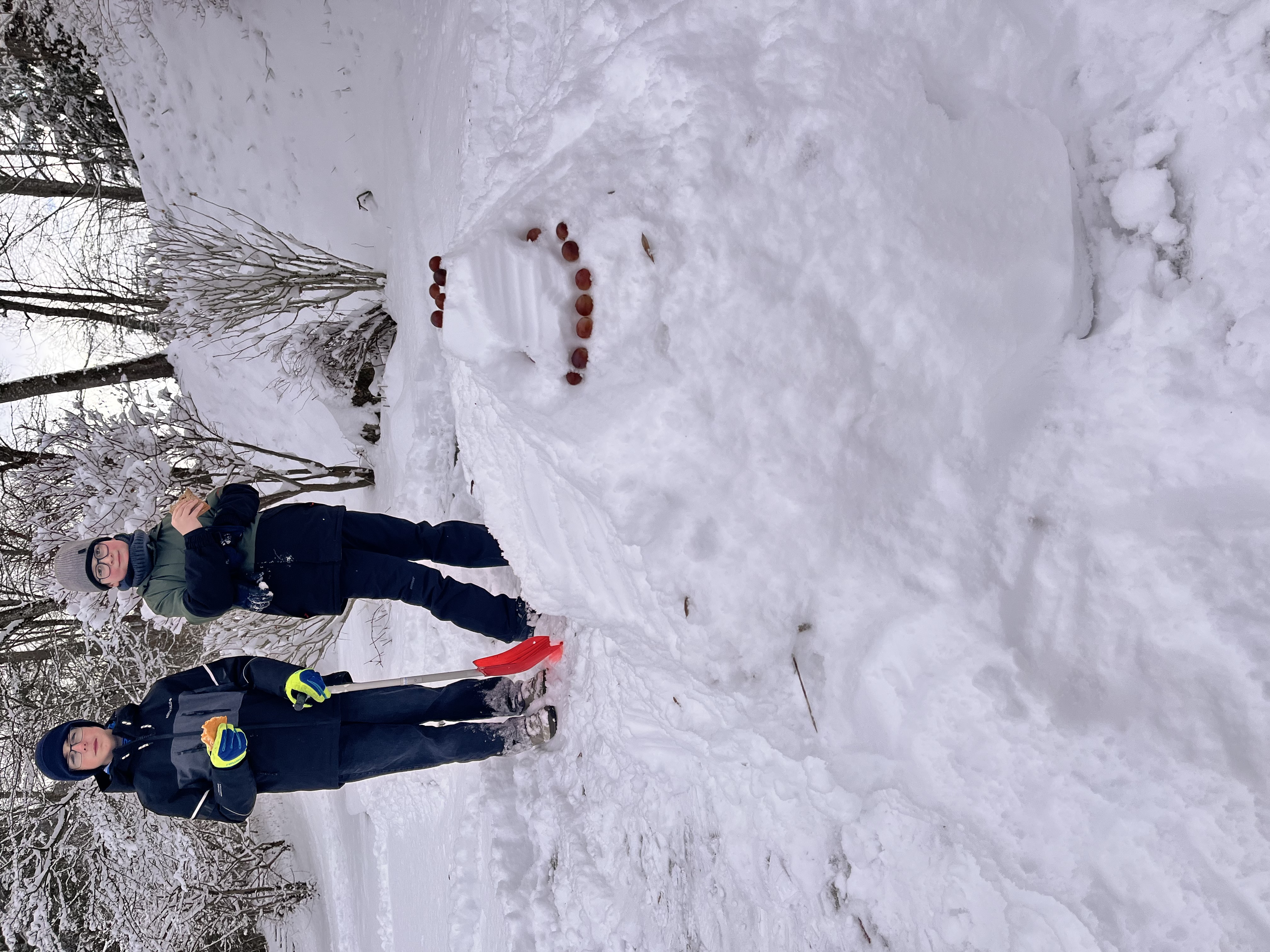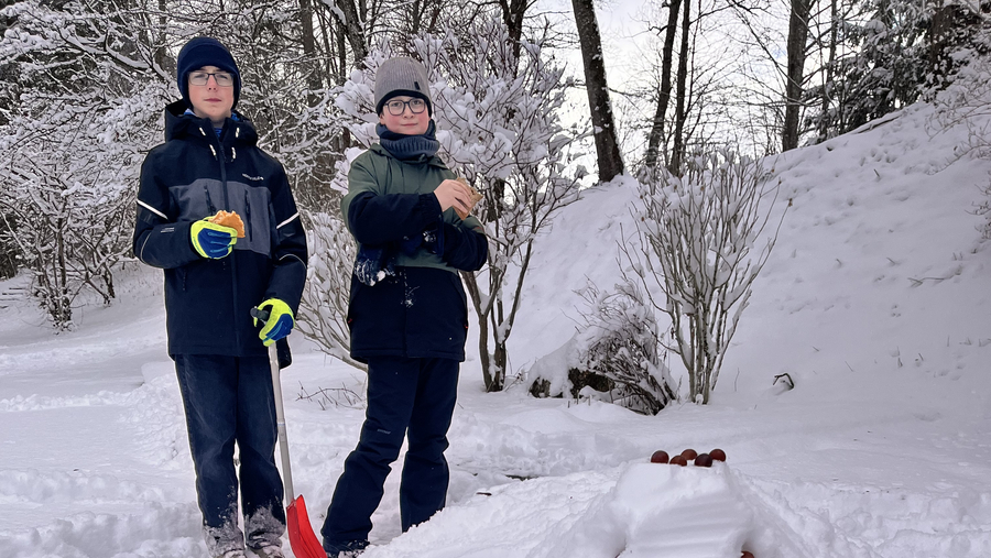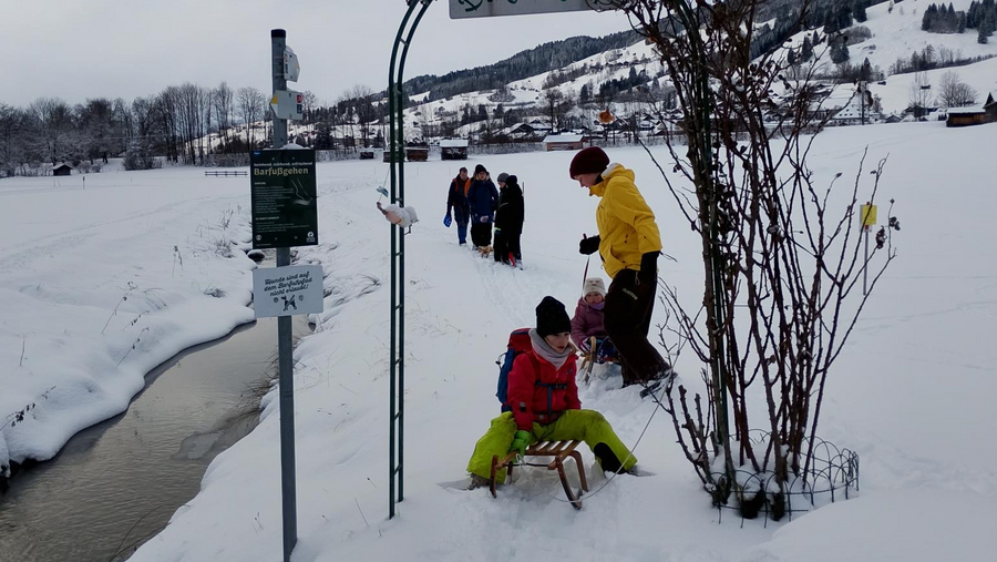 Wir trafen uns am Sportplatz in Bad Hindelang und wanderten dann mit Schlitten und Schaufeln zum Barfußpfad von Bad Hindelang nach Bad Oberdorf. Natürlich liefen wir mit Schuhen los, und diesmal war der Pfad genauso schön wie im Sommer. Während wir eine Kaffeepause einlegten, bauten wir eine Schneeschildkröte mit Weintraubenaugen. Anschließend stärkten wir uns, um für die frostigen Temperaturen gewappnet zu sein.