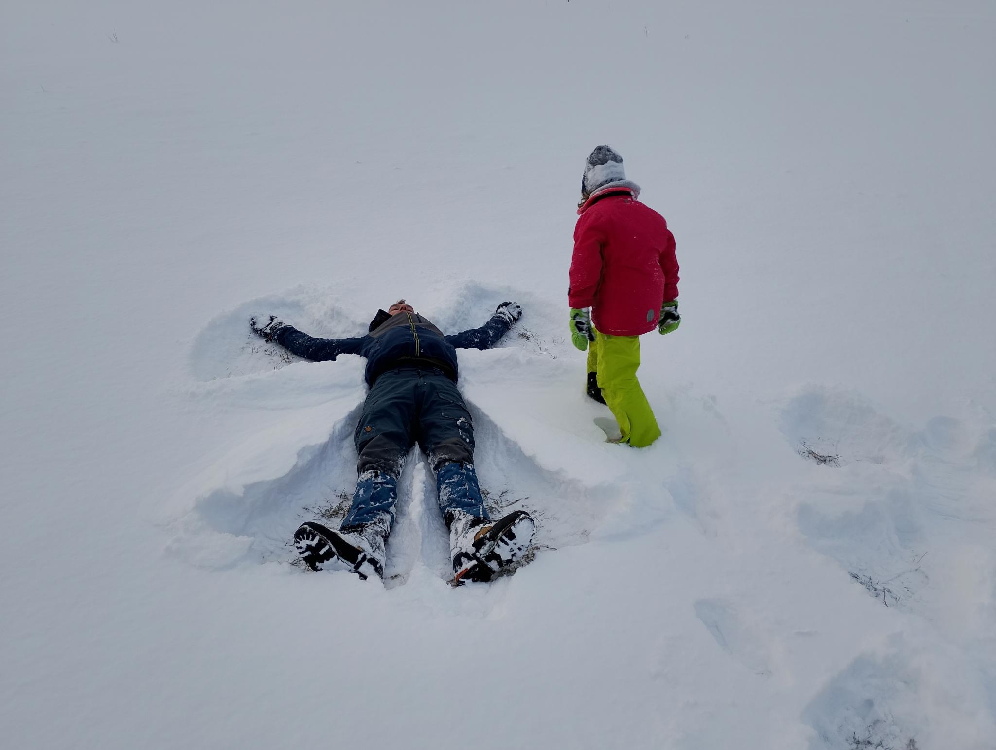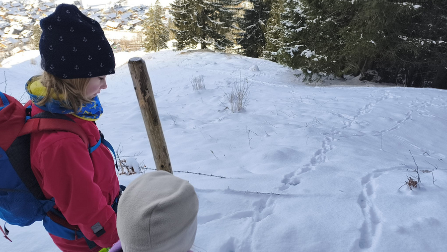 Am Sonntag erwartete uns blauer Himmel, und beim Frühstück konnten wir sogar den Mond über dem Horizont beobachten, wie er unterging. Für die jüngeren Kinder war das echt der Hingucker. Danach stellten wir unsere Sachen zusammen und zogen zum ersten Mal die Schneeschuhe an, um eine Testrunde auf dem Jubi-Gelände zu gehen.