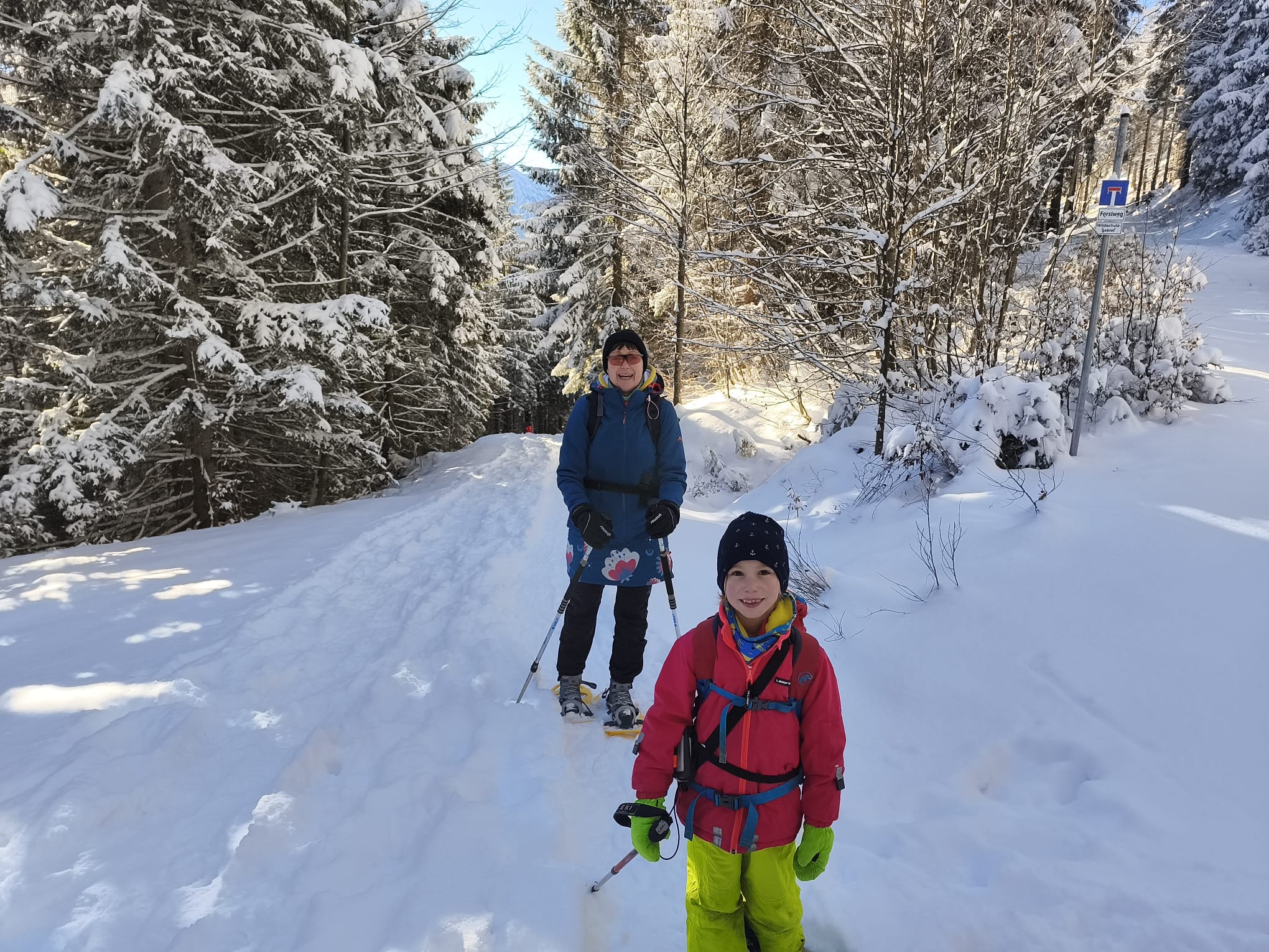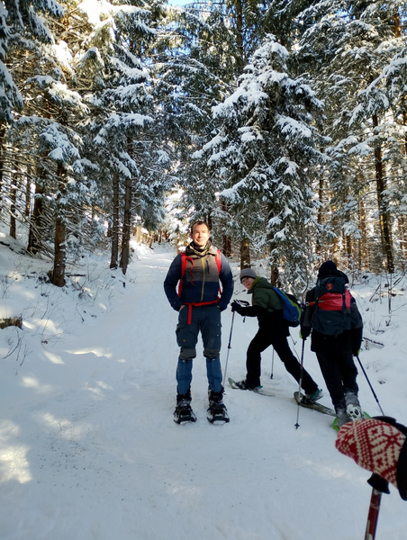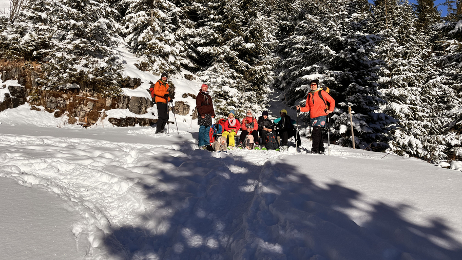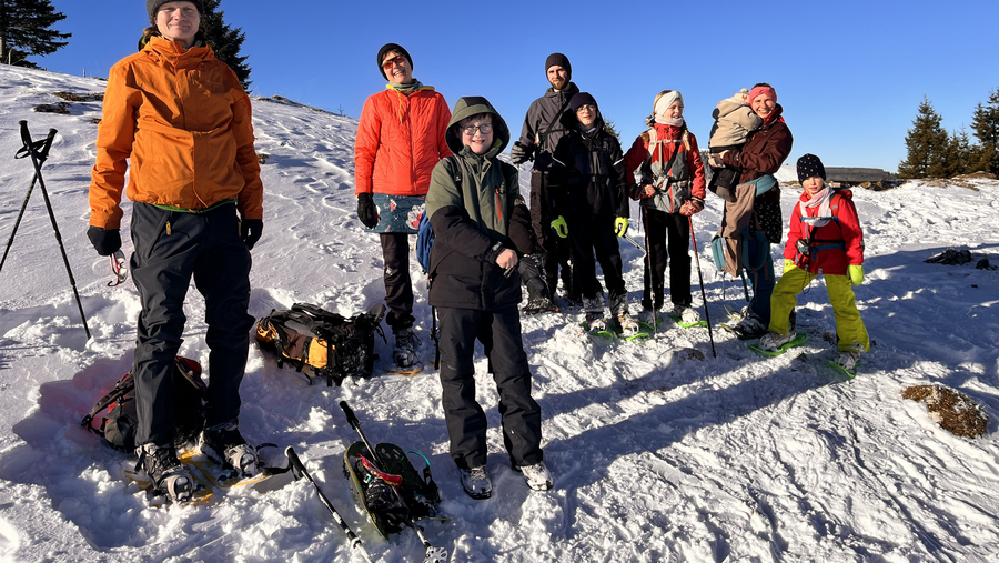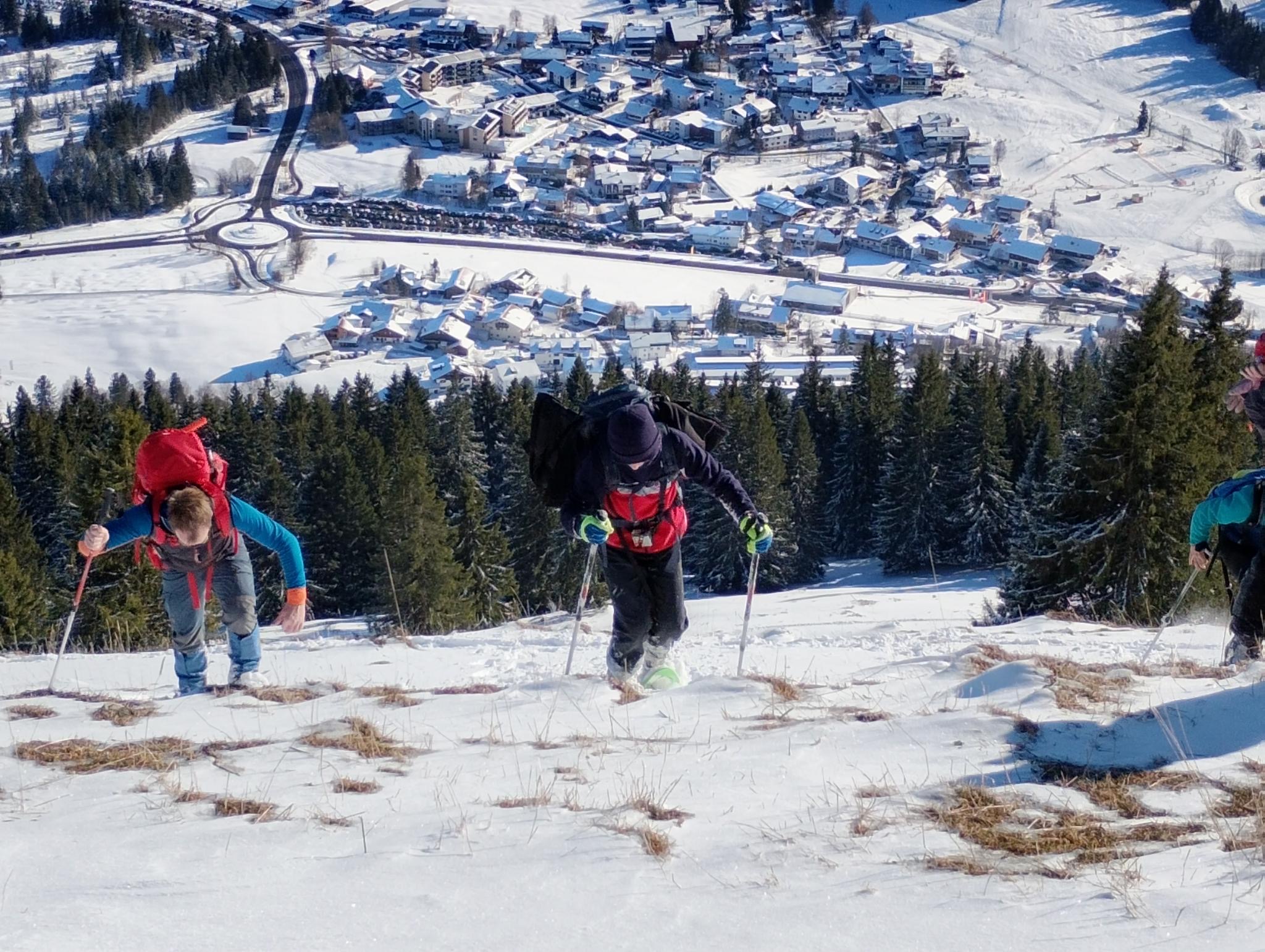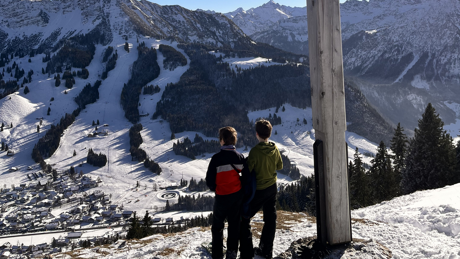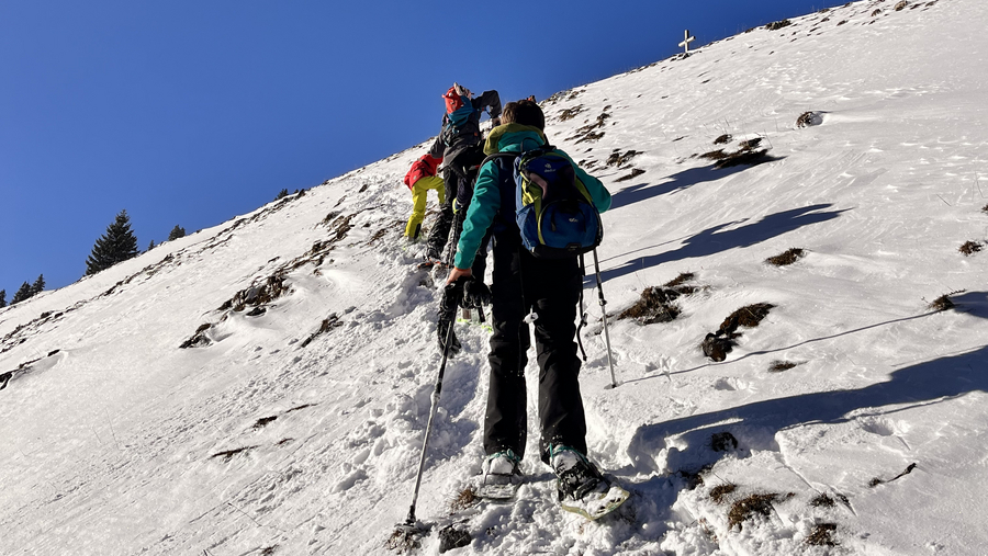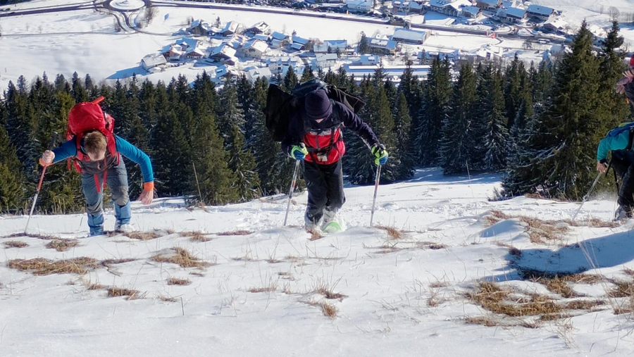 Dann fuhren wir mit dem Bus nach Oberjoch, um von dort aus unsere Wanderung auf den Ornach zu beginnen. Am Waldrand und am Anfang des Winterweges zogen wir die Schneeschuhe an und schalteten die LVS-Geräte auf Sendung. Diese haben alle bestanden. Sonnenschein und eine geringe Lawinengefahrenstufe (1) machten diese Tour für Kinder und Eltern gleichermaßen möglich. Der Weg führte in Serpentinen durch den Wald und die letzten Höhenmeter über Wiesengelände bis zum Gipfel. Im Aufstieg wurde sogar das eigene Spurenlegen mit den Schneeschuhen trainiert. Am Gipfel waren dann alle geschafft, aber sehr zufrieden. Der anschließende Abstieg war sehr entspannt, weil die Schneeschuhe gut durch den Schnee glitten.