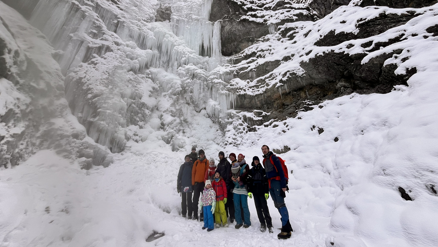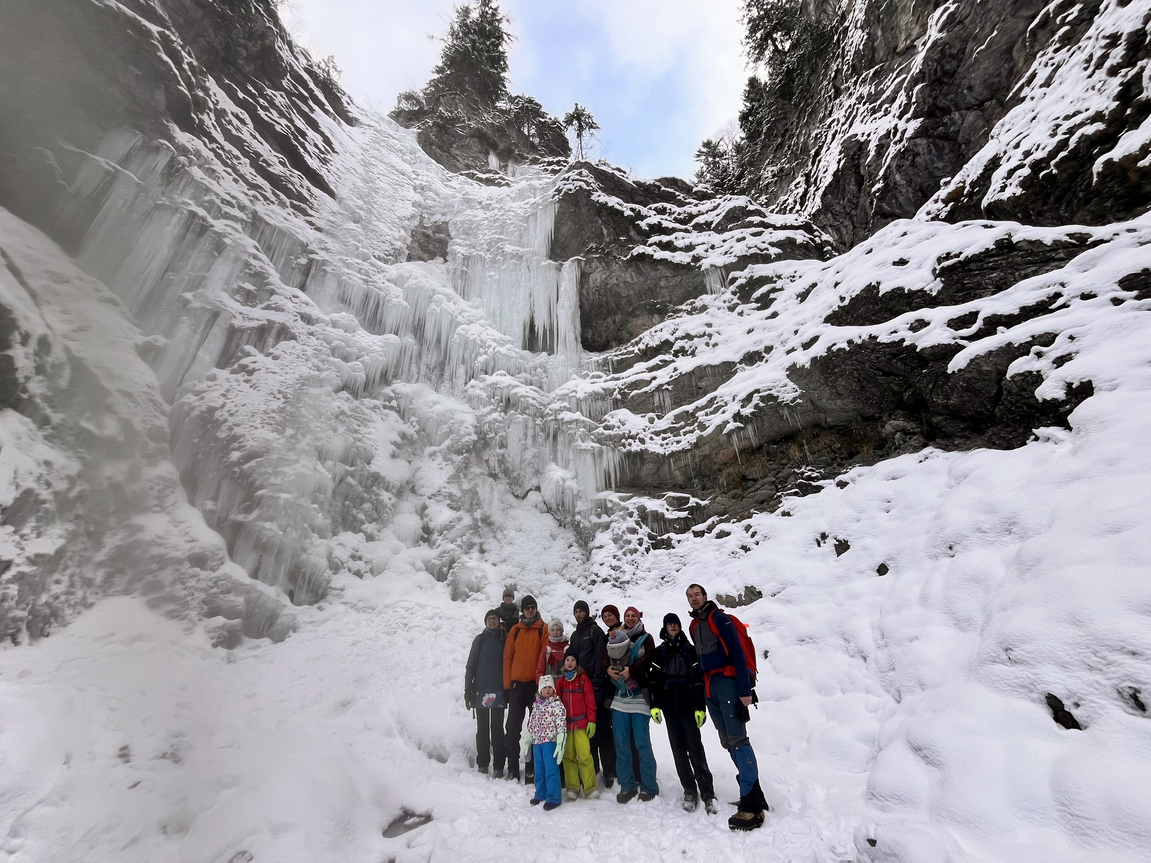 Wir wanderten von der Jubi entlang des Wildbaches und querten dann weiter in Richtung Schleierfall. Zwei aus der Gruppe wollten noch ein Wintereisbad nehmen. Leider muss an dieser Stelle gesagt werden, dass wir es getan hätten, wenn der Wasserfall nicht so wunderschön eingefroren gewesen wäre. Dieses war für alle dennoch ein Wunderwerk der Natur, denn er war sehr beeindruckend eingefroren und könnte für Alpinisten sogar zu anderen Sportarten einladen.