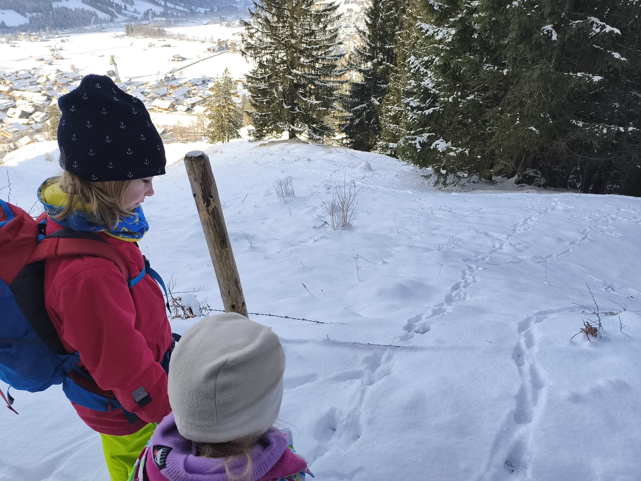 An der Kirche in Bad Oberdorf entdeckten wir einen schönen Rodelhang. Dort rodelten wir, rollten durch den Schnee oder gestalteten Schneeengel. Danach ging es zum Check-in in die Jubi, zum Zimmerbeziehen, Spielen, Abendessen und zum Vorbereiten des Tourenprogramms für den nächsten Tag.