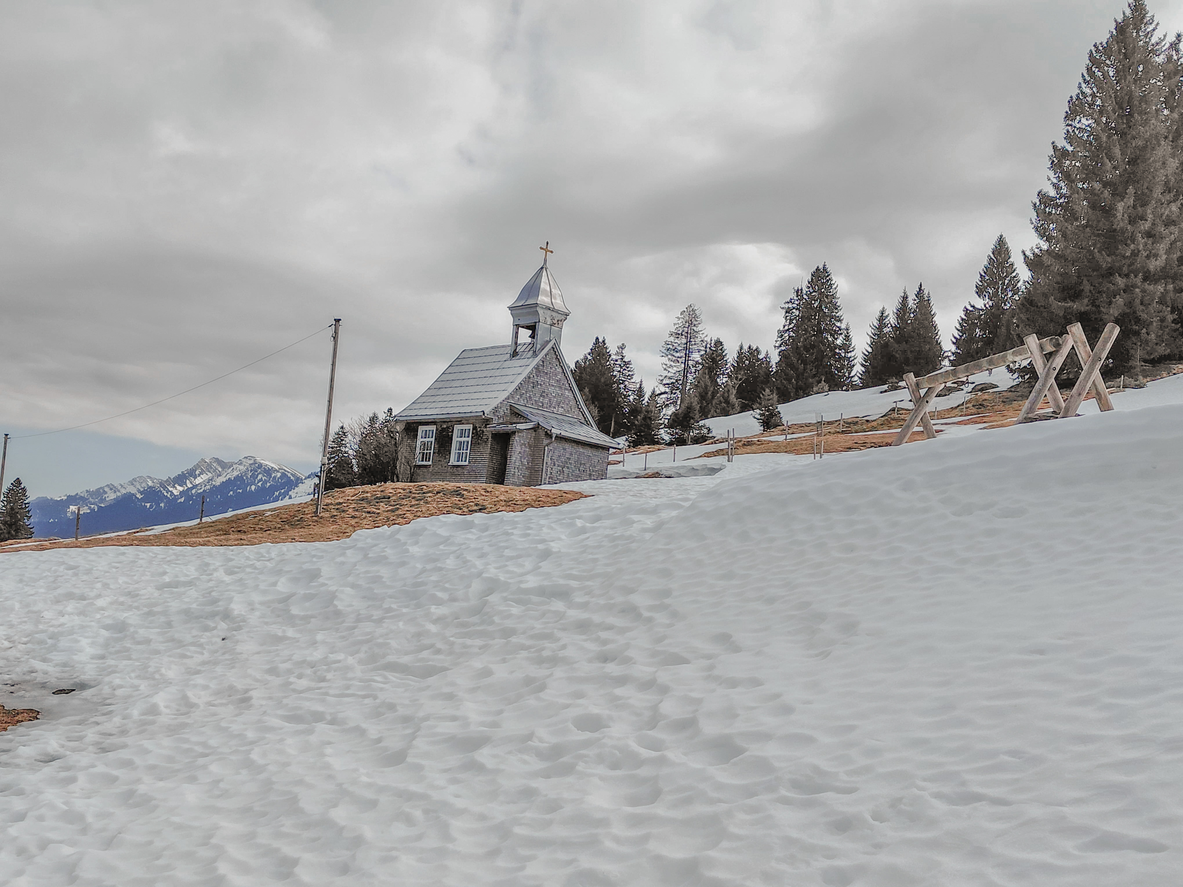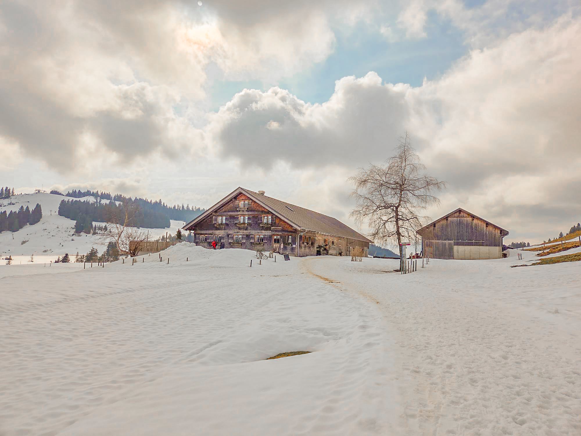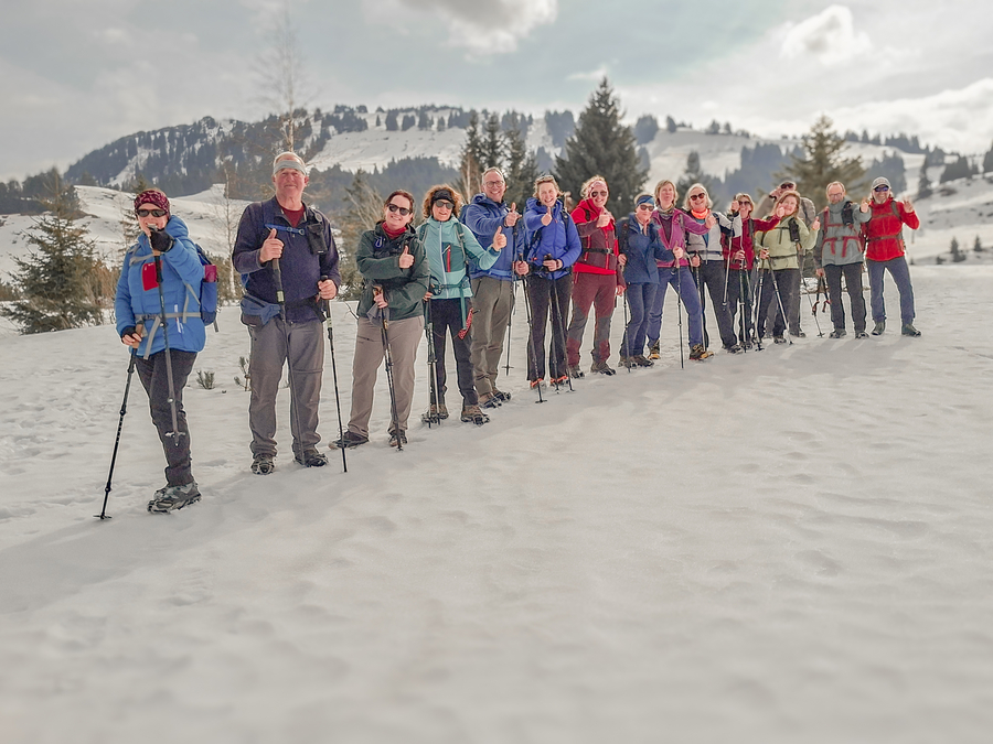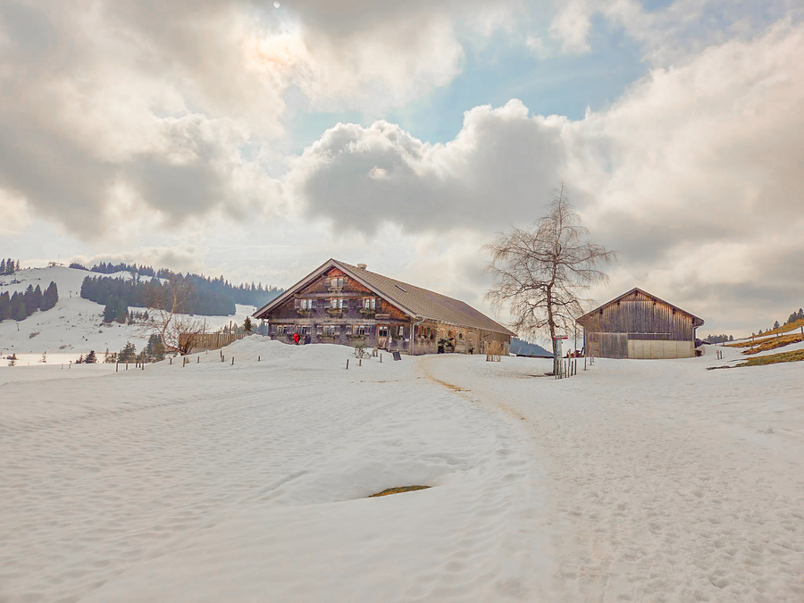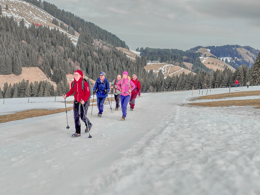 Vom Parkplatz der Imbergbahn laufen wir einen Feldweg hoch zur Piste. Doch schon bald müssen wir unsere Grödel anziehen, denn der Weg ist eisig und rutschig. Steil geht es das kurze Stück über die Piste hoch zum Imberghaus (1.225 m). Von dort beginnt der Winterwanderweg zu unserem Ziel. Anfangs laufen wir noch durch ein Waldstück, bevor es abwärts Richtung Berggasthof Hochbühl geht. Wir hatten schon Bedenken, ob für unsere Winterwanderung noch genügend Schnee liegt. Die Bedingungen waren optimal, erst am Nachmittag wurde der Schnee etwas sulzig.